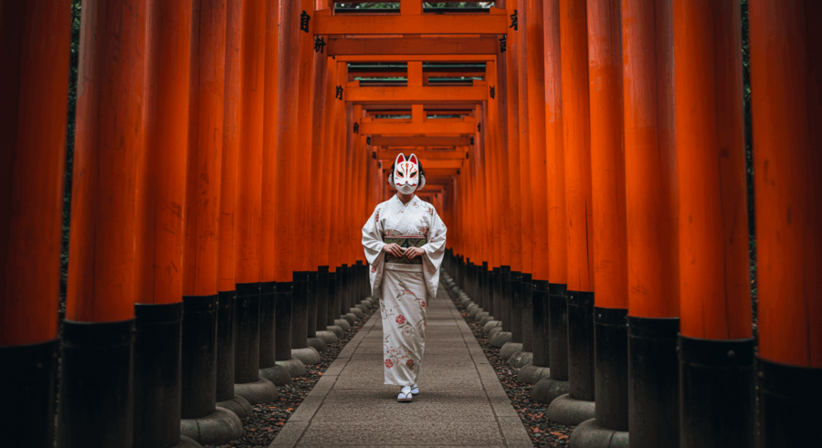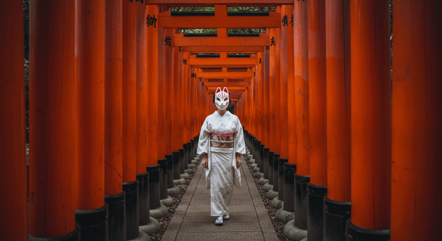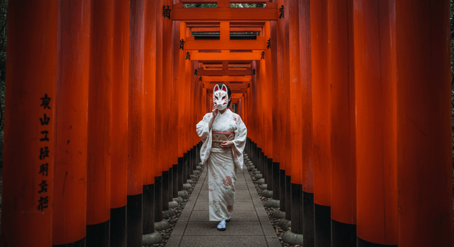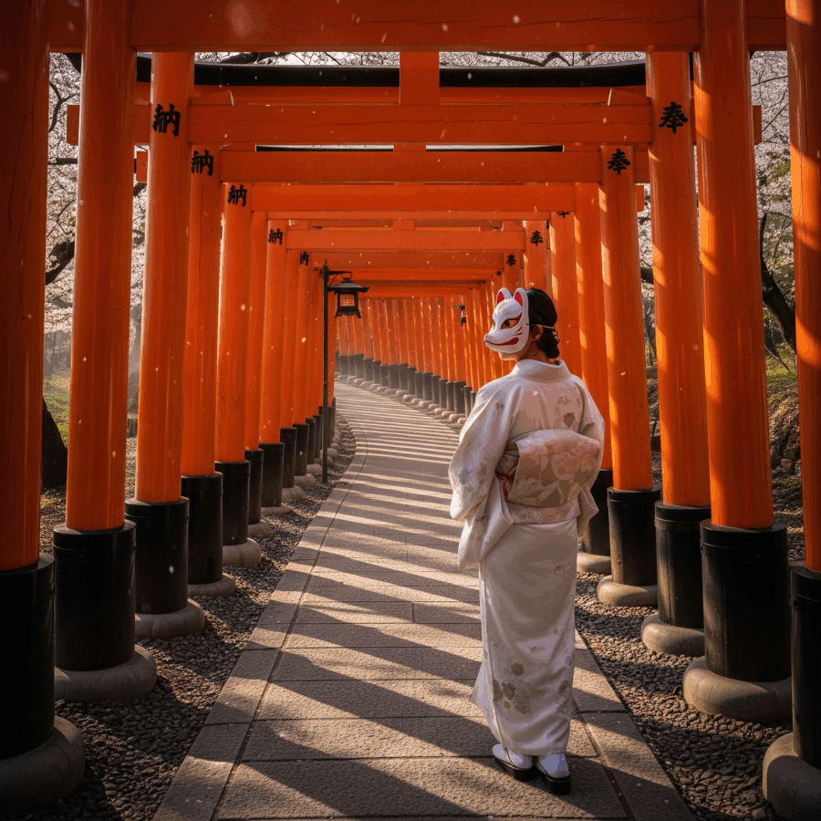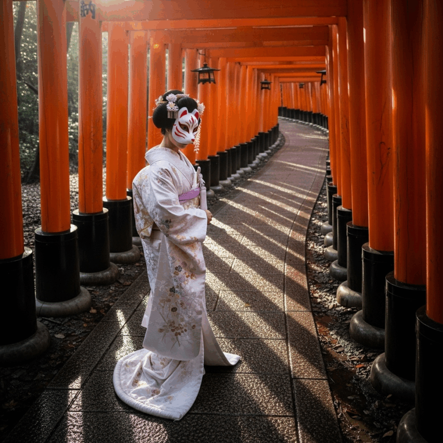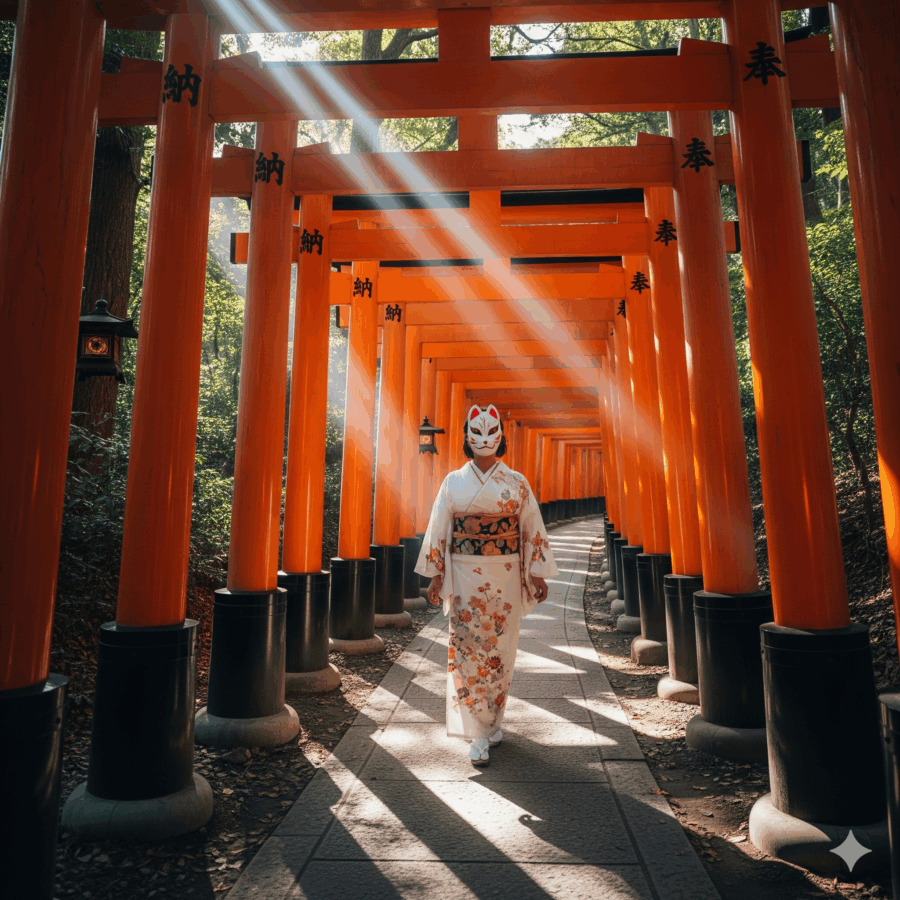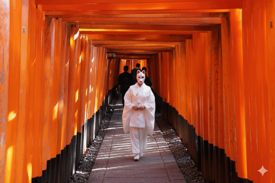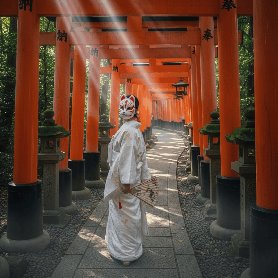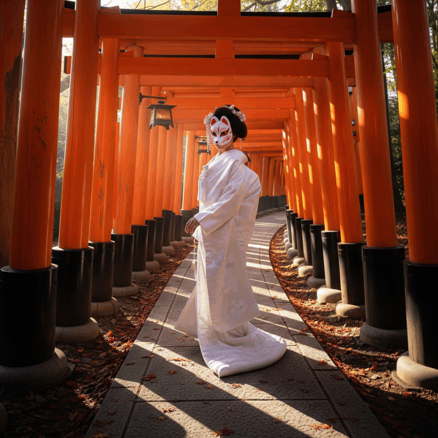A woman wearing a white kimono and a traditional fox mask, walking down a path of vibrant orange torii gates at Fushimi Inari-taisha shrine in Kyoto, Japan. realistic photo, high quality, cinematic lighting, dramatic.